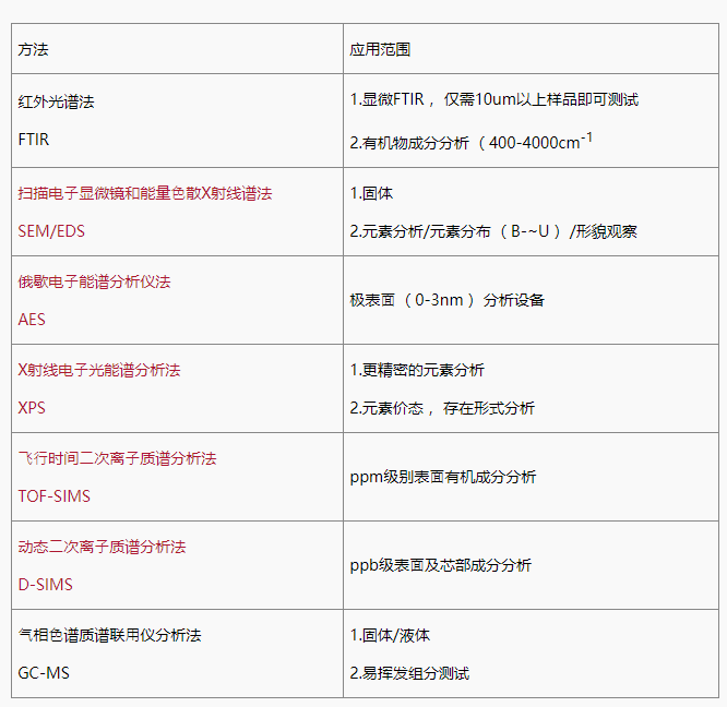针对产品表面的有机异物,根据异物的形态、检测深度及检测面积等差异而选用特定的仪器,对其有机成分进行分析,判定其主成分,从而获取异物信息的一种分析方法。
